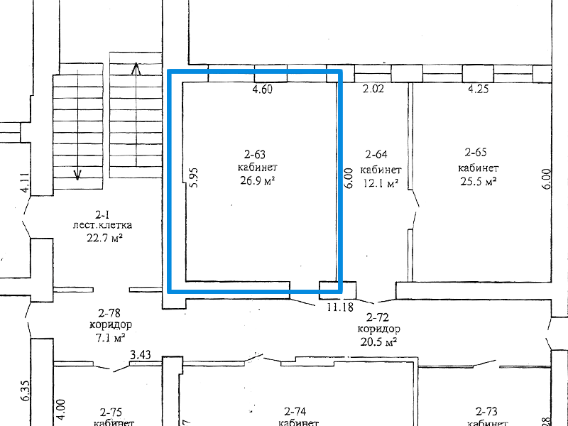 Расположено на третьем этаже трёхэтажного здания
